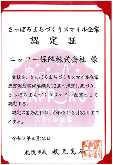 当社でのボランティア活動や環境美化活動が認められ「さっぽろまちづくりスマイル企業」に認定していただきました。
