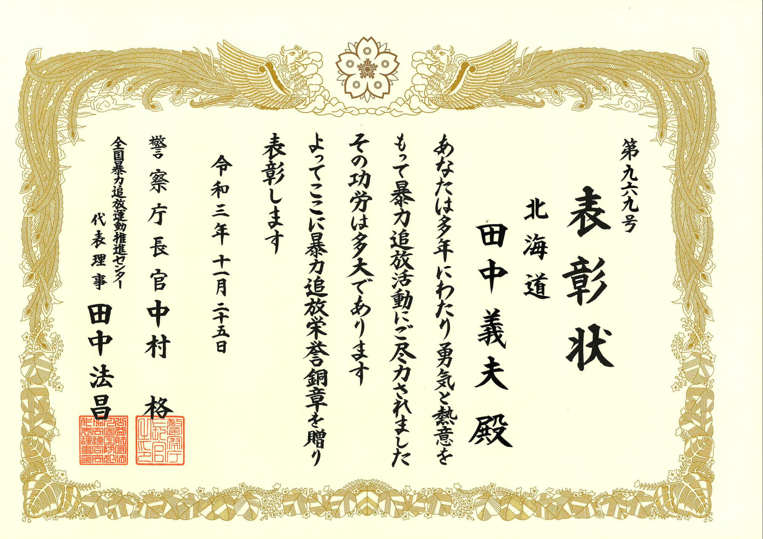 当社の田中義夫会長が、警察庁長官・全国暴力追放運動推進センター代表理事連名による「暴力追放栄誉銅章」を受賞しました。