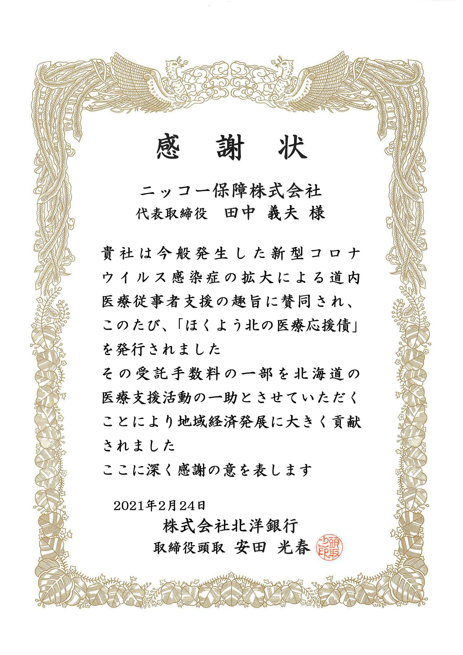 当社ニッコー保障は、2021年2月24日付で北洋銀行において「ほくよう北の医療応援債(第1回無担保社債 北洋銀行・北海道信用保証協会共同保証付)」を発行したことをご報告いたします。「ほくよう北の医療応援債」とは発行金額の0.2%相当額を「エールを北の医療へ!」を通して、新型コロナウイルス感染拡大防止の最前線でご尽力されている道内医療従事者に寄付する仕組みとなっている私募債です。今後とも地域貢献すべく精進して参りますので、よろしくお願いいたします。